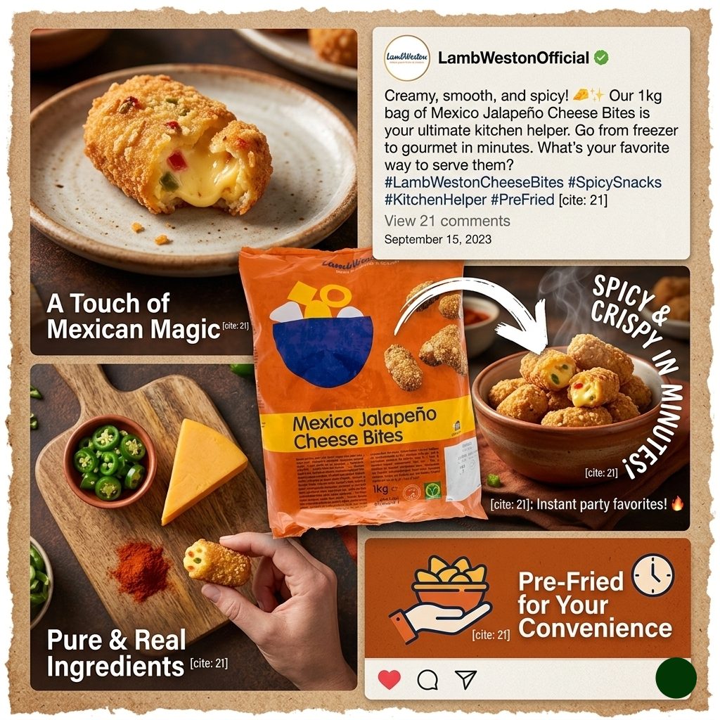 استمتع بوجبة خفيفة غنية بالنكهات، تتميز بحشوة جبن كريمية ممزوجة بقطع هالبينو حارة ومغطاة بطبقة مقرمشة ذهبية اللون. تقدم هذه المقبلات اللذيذة بحجم اللقمة توازناً مثالياً بين الحرارة والقوام الكريمي، بنكهة مكسيكية أصيلة تُضفي لمسة مميزة على أي قائمة طعام.