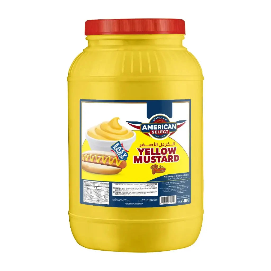 This American Select Yellow Mustard comes in a heavy-duty 1-gallon (3.78L) plastic jar, making it an ideal choice for high-volume foodservice environments, large gatherings, or home kitchen refills. It features a classic, smooth texture and a bold, tangy flavor derived from high-quality mustard seeds and turmeric.
